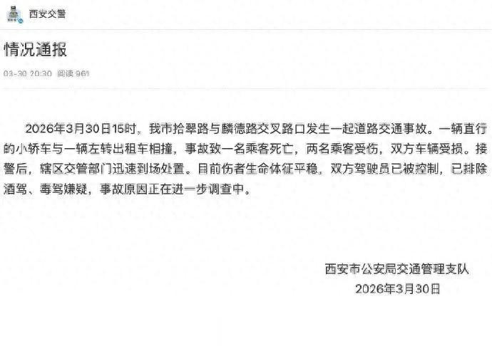 据@西安交警 通报 :2026年3月30日15时,我市拾翠路与麟德路交叉路口发生沿途谈路交通事故。一辆直行的小轿车与一辆左转出租车相撞,事故致又名乘客去世,两名乘客受伤,两边车辆受损。接警后,辖区交管部门速即到场惩办。现在伤者人命体征牢固,两边驾驶员已被为止,已抹杀酒驾、毒驾嫌疑,事故原因正在进一步打听中。
