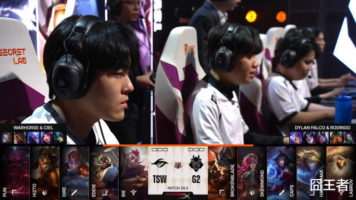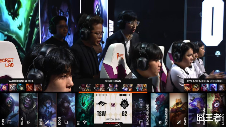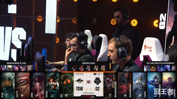 第一局比赛,T SW蓝色方,禁用:发条、奎桑提、瑞兹、妮蔻、娜好意思,采选:Pun奥恩、Hizto皇子、Dire阿萝拉、Eddie飞机、Bie洛;G 2红色方,禁用:阿卡丽、泰坦、韦鲁斯、卡莎、芸阿娜,采选:BrokenBlade兰博、SkewMond蔚、Caps阿狸、Hans Sama伊泽瑞尔、Labrov巴德