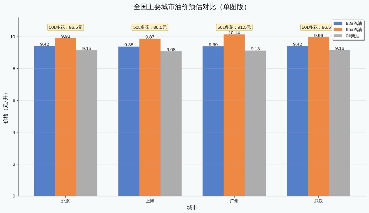 这意味着,北京、上海、广州、武汉等一线城市的92号汽油将全面冲破9元/升,广州95号汽油更是径直站上10元关隘。以常见的50升家用车油箱想象,加满一箱92号汽油需多掏86.5元,95号则多花91.5元,尽头于一罐中档婴儿奶钱径直挥发。